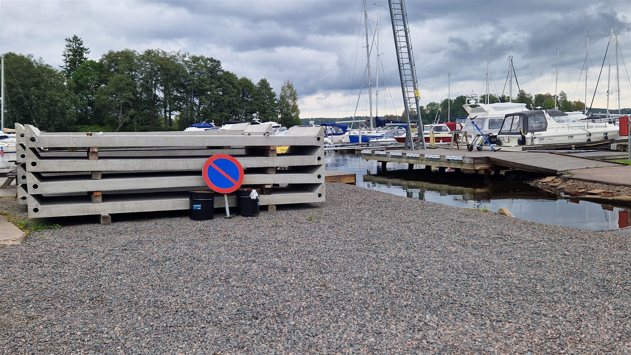 Ingen har väl missat betongfundamenten till nya rampen som förvarats vid kranen i sommar. De kommer flyttas inför upptagningarna med mobilkranen då arbetet med nya rampen sätter fart först efter upptagningarna. Det arbetet beräknas pågå i slutet av oktober och november. Utförare av detta uppdrag är Hirsikangas Gräv & Schakt.